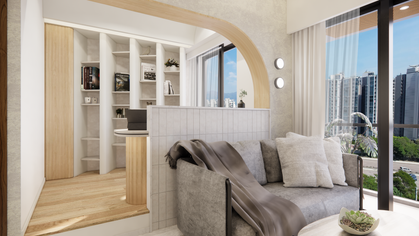 This living area is designed with expansive windows, light-toned materials, and soft textures, creating an open and inviting environment that effortlessly blends with the cityscape beyond, while subtle architectural curves add warmth and character.