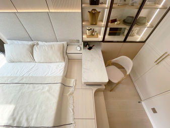 Marble surfaces, warm wood, and illuminated display cabinetry shape a cozy environment for relaxation and style.