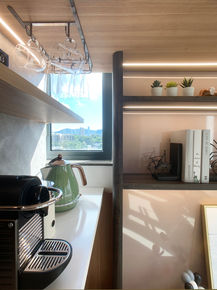 Tiered steps, built-in shelving, and expansive windows create a bright, versatile living space that seamlessly adapts to modern needs.