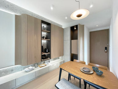 Graceful curves, concealed lighting, and neutral wood tones create a refined storage solution that elevates the modern living area.